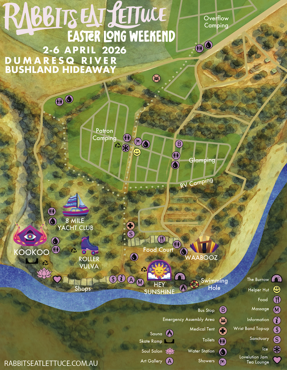 Rabbits Eat Lettuce is located at the stunning and expansive Cherrabah Resort, set on 5,000 gorgeous acres of wilderness land, located in west Bundjalung, home to the Gidhabal People. Cherrabah Resort is located a short drive from the historical town of Warwick in South East QLD right on the NSW / QLD border.